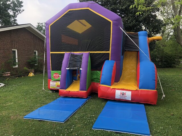 This unit features a huge moonwalk area, a crawl-through, a climbing obstacle, exterior slide, & an interior and exterior basketball hoop.